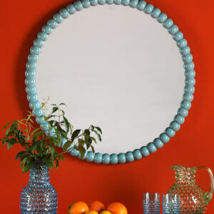 • The Ruan Bobbin Round Mirror in gloss blue finish offers a contemporary twist on a traditional design. The Bobbin mirror features a wooden bobbin on top of the mirror, which adds a fun and quirky touch. The natural wood finish complements any decor, from modern to traditional. The Bobbin mirror is designed to complement the Spool Bobbin table & Floor lamp, which…