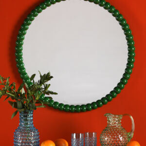 • The Ruan Bobbin Round Mirror in a deep gloss green finish offers a contemporary twist on a traditional design. The Bobbin mirror features a wooden bobbin on top of the mirror, which adds a fun and quirky touch. The natural wood finish complements any decor, from modern to traditional. The Bobbin mirror is designed to complement the Spool Bobbin table & Floor…