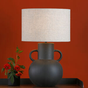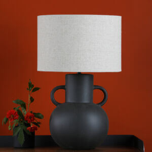 - Introducing the Urn Black Ceramic Table Lamp - a modern twist on traditional Greek urns. Meticulously crafted with attention to detail, this terracotta lamp features a tactile black finish that exudes charm. Its elegant form is complemented by a minimalist ivory shade, achieving a perfect balance of dramatic design and sophisticated style. The lamp's braided black cable enhances its visual…