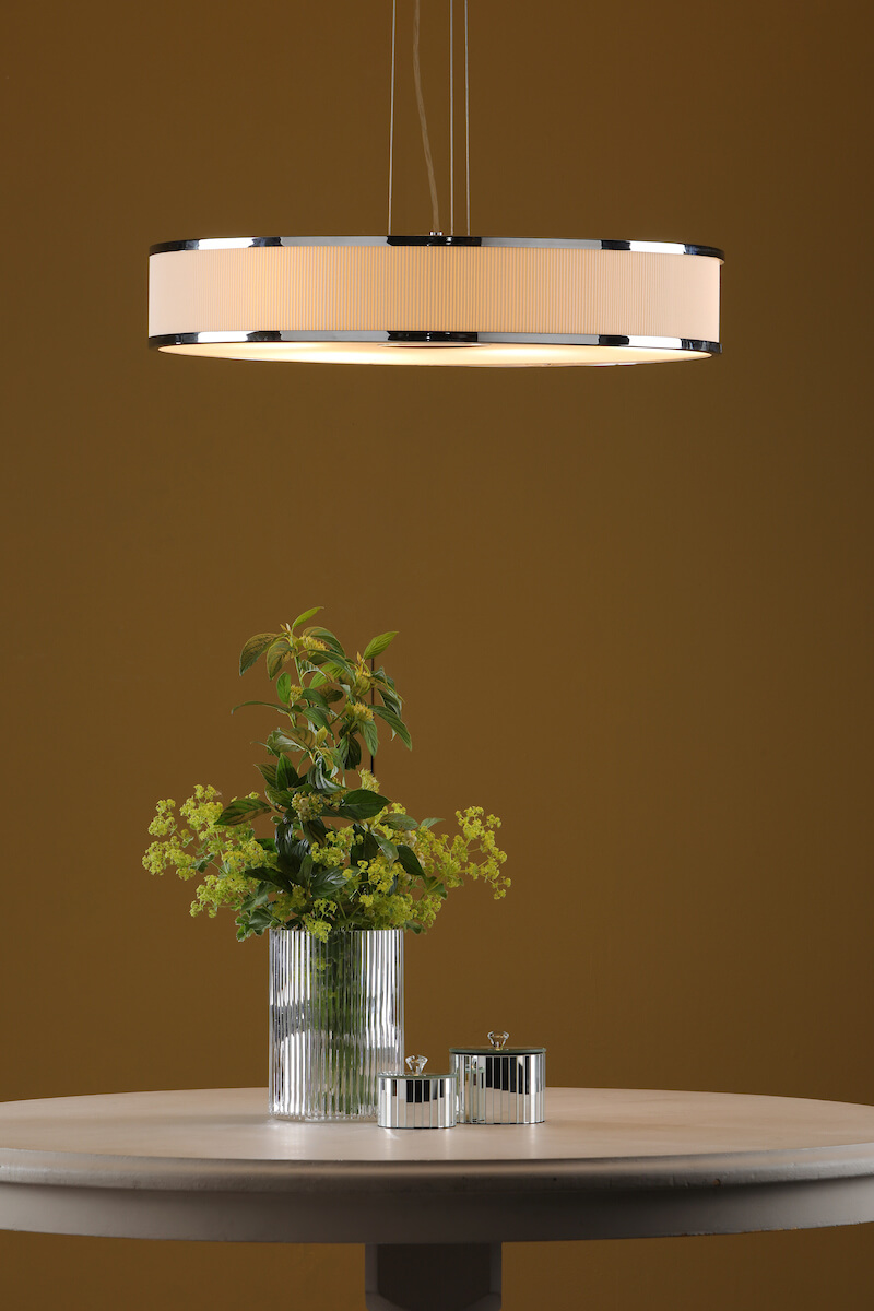 The Alvaro 6 light pendant offers a modern look with its slender silhouette, pleated ivory cotton fabric, and frosted diffuser. It is available in two sizes and three colours, making it a versatile choice for any space. With its adjustable suspension wires and sleek design, it can be hung low over a table or in a double height space to create a stylish look.