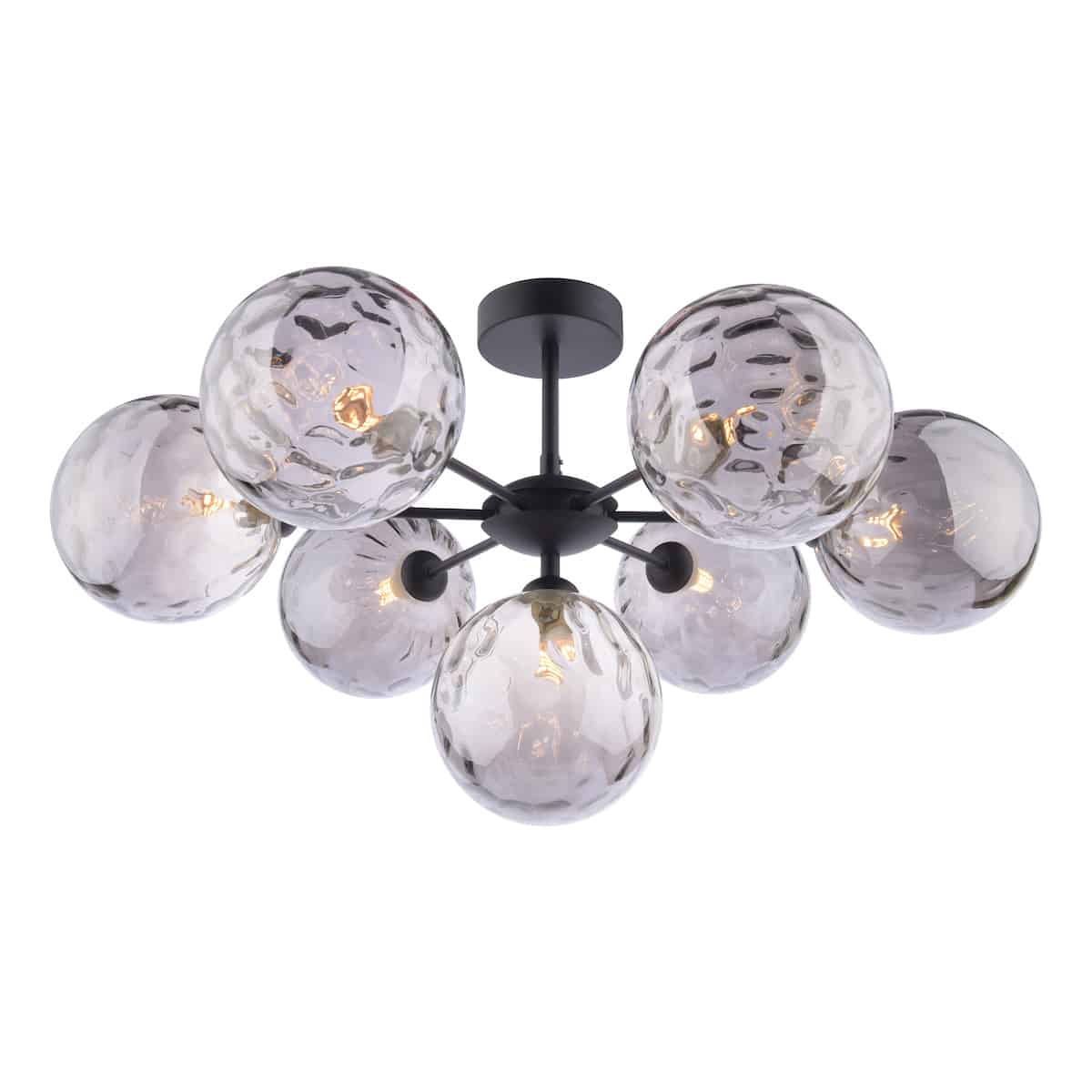 The Cohen 7 light semi flush ceiling light in matt black and brilliantly reflective smoked glass shades.