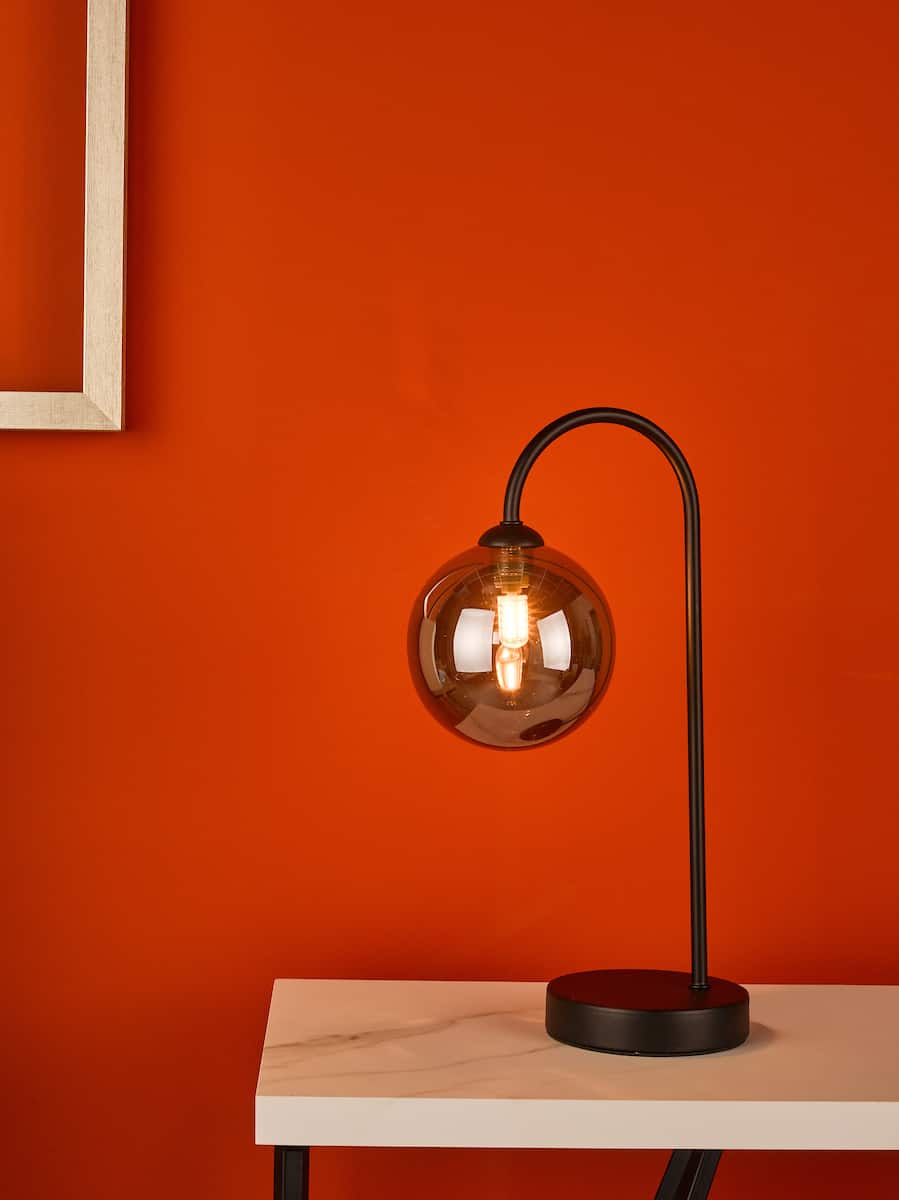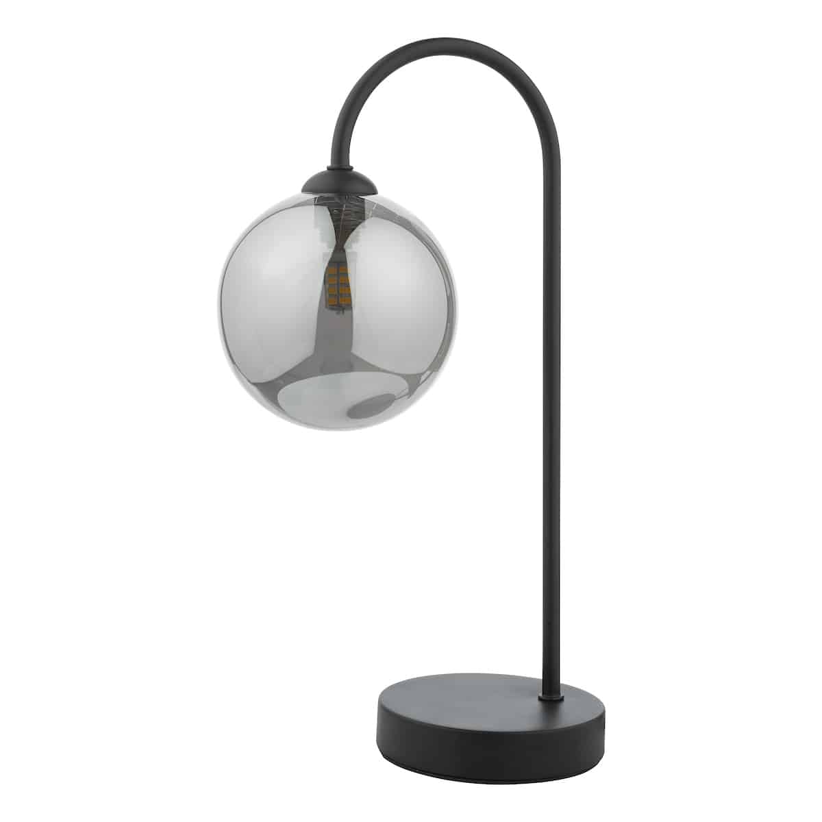 The Eisse touch table lamp in matt black with smoked glass follows the current geometric minimalist design trend with a large radius neck leading to a beautiful mirror smoked glass.