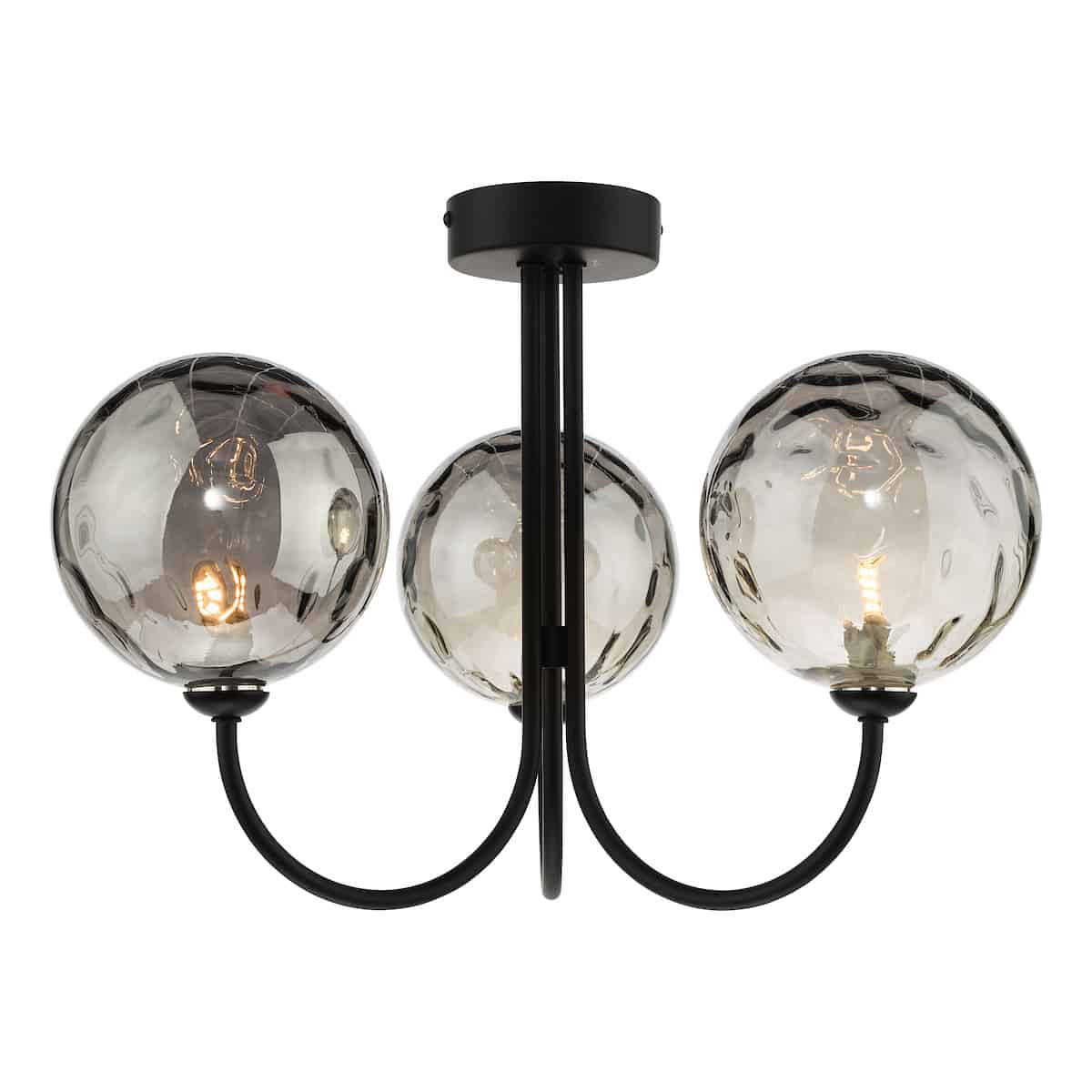 The Jared 3 light semi flush ceiling light in black is a statement of simplicity. With sweeping J-arms and oversized clear dimpled glass.