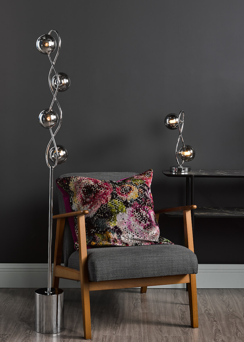 The Lysandra 4 Light Floor Lamp is a beautiful floor lamp with a fluid shape and smoked glass shades. The Lysandra lamp features a polished chrome frame with a clear in-line rocker switch. The Lysandra lamp is designed to complement any living space in your home, from the living room to the bedroom. The Lysandra 4 light floor lamp takes a four G9 bulbs (not supplied).
