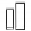 A family of contemporary statement tables with a solid rustic concrete effect top supported by angular black legs.