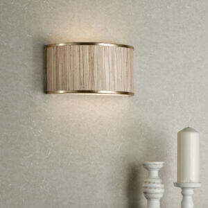 - The Fenella 2 Light Wall Light is a captivating lighting fixture that seamlessly combines elegance and natural beauty. The Gold Leaf finish adds a touch of opulence, while the Seagrass shade brings a unique texture and warmth to the design. The inclusion of a glass diffuser ensures a soft and diffused light, creating a cozy and inviting ambiance in any…