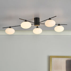 • The minimalist Jasper black 5 light semi flush ceiling light is finished in matt black with subtle spiral textured opal glass resting on fine black arms mounted on a narrow minimalist centre body. It has a low profile, so is suitable for low ceiling heights. To aid installation, an optional 10cm cover plate is included, to help hide any previous…